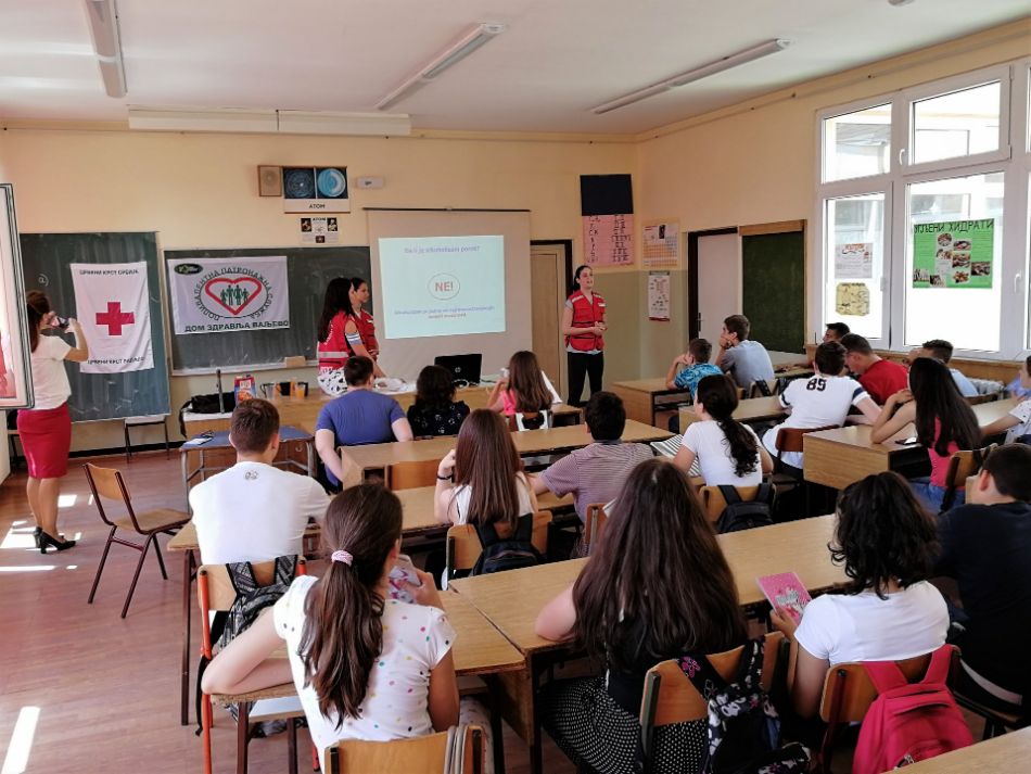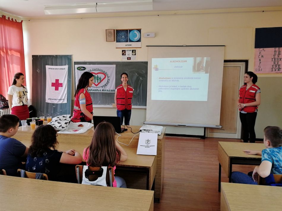 Mladi - mladima. Vršnjački edukatori Crvenog krsta Valjevo, učenici srednjih škola koji su prošli višednevnu stručnu obuku, realizovali su nova predavanja i radionice za učenike sedmog razreda u Prvoj osnovnoj školi u oblasti prevencije bolesti zavisnosti, ovoga puta na temu „Alkoholizam kod mladih“. Rad je timskog karaktera u kojem učestvuju po tri vršnjačka edukatora, koristeći adekvatno pripremljene prezentacija koje imaju za cilj da mladima približe sveobuhvatnu problematiku potencijalne zavisnosti od alkoholizma na njima prihvatljiv i razumljiv način.
