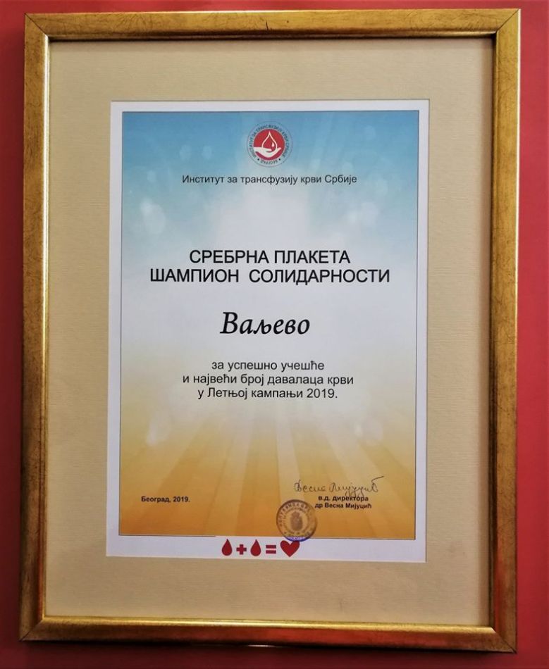 Crveni krst Valjevo je ovogodišnji dobitnik visokog i značajnog priznanja Srebna plaketa – „Šampion solidarnosti“ od Instituta za transfuziju krvi Srbije, za uspešno učešće i najveći broj davalaca krvi u ovogodišnjoj Letnjoj kampanji dobrovoljnog davalaštva krvi u Republici Srbiji. Nagrada je uručena na svečanom prijemu u Skupštini grada Beograda na kome su predstavnici Instituta za transfuziju krvi Srbije uručili priznanja najuspešnijim gradovima, opštinama, organizacijama i pojedincima u 2019. godini.