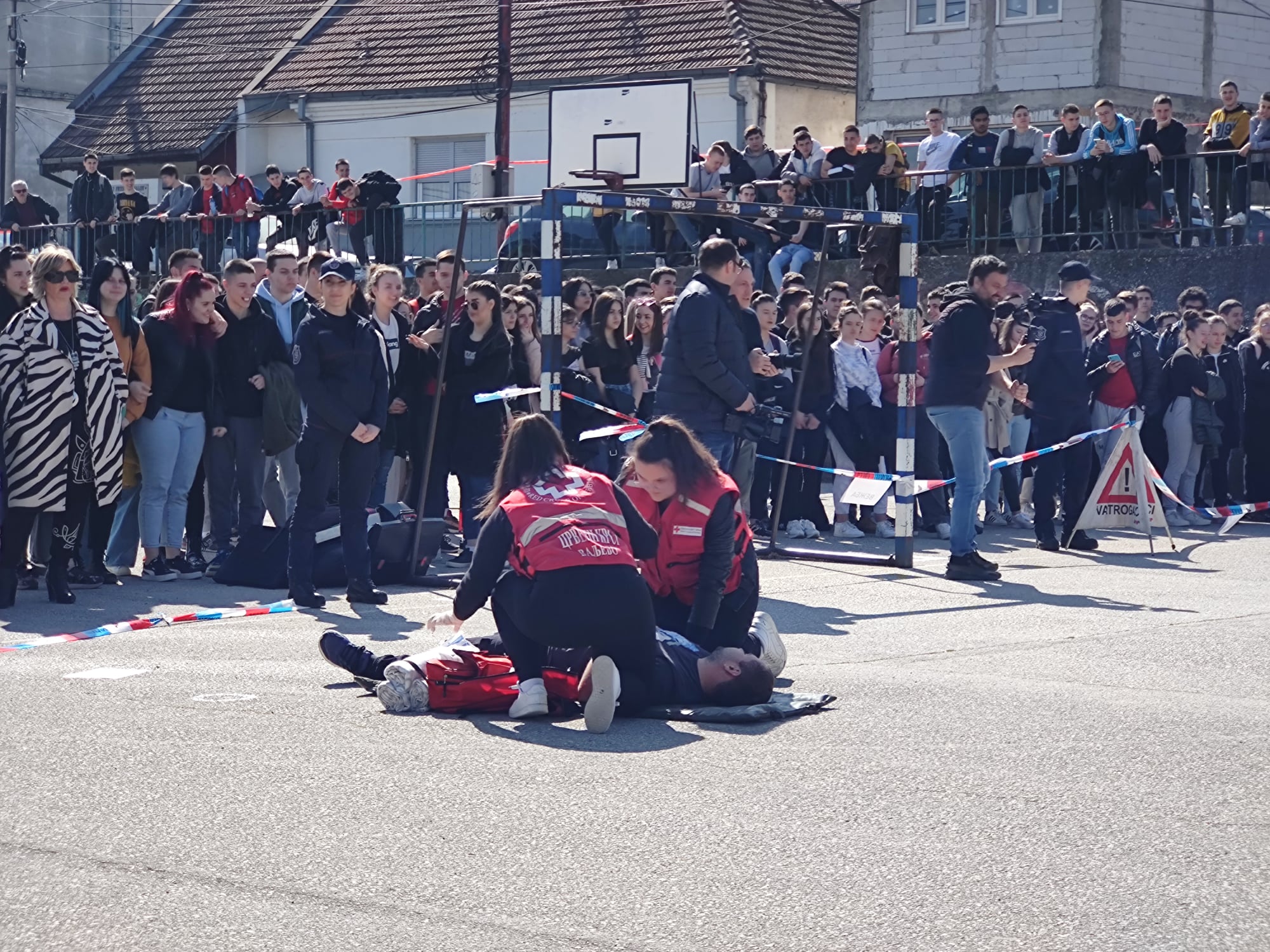 Nakon dojave, sve ekipe su pristupile rešavanju taktičkog zadatka. Prva, praktično na licu mesta delovala je ekipa prve pomoći Crvenog krsta Valjevo. Oni su u trenutku nezgode bili u tehničkoj školi u ulozi demonstratora prve pomoći učenicima Saobraćajnog smera. Nakon dojave, ekipa od šest članova uputila se ka akcidentu, na sportski teren škole. Ova ekipa predstavlja takmičarsku grupu prve pomoći, učenica medicinske škole Valjevo, okupljenih u sekciji Omladine, pomenute škole. Ekipa je na licu mesta izvršila trijažu i u skladu sa zatečenom situacijom, pružila mere neodložne pomoći.
