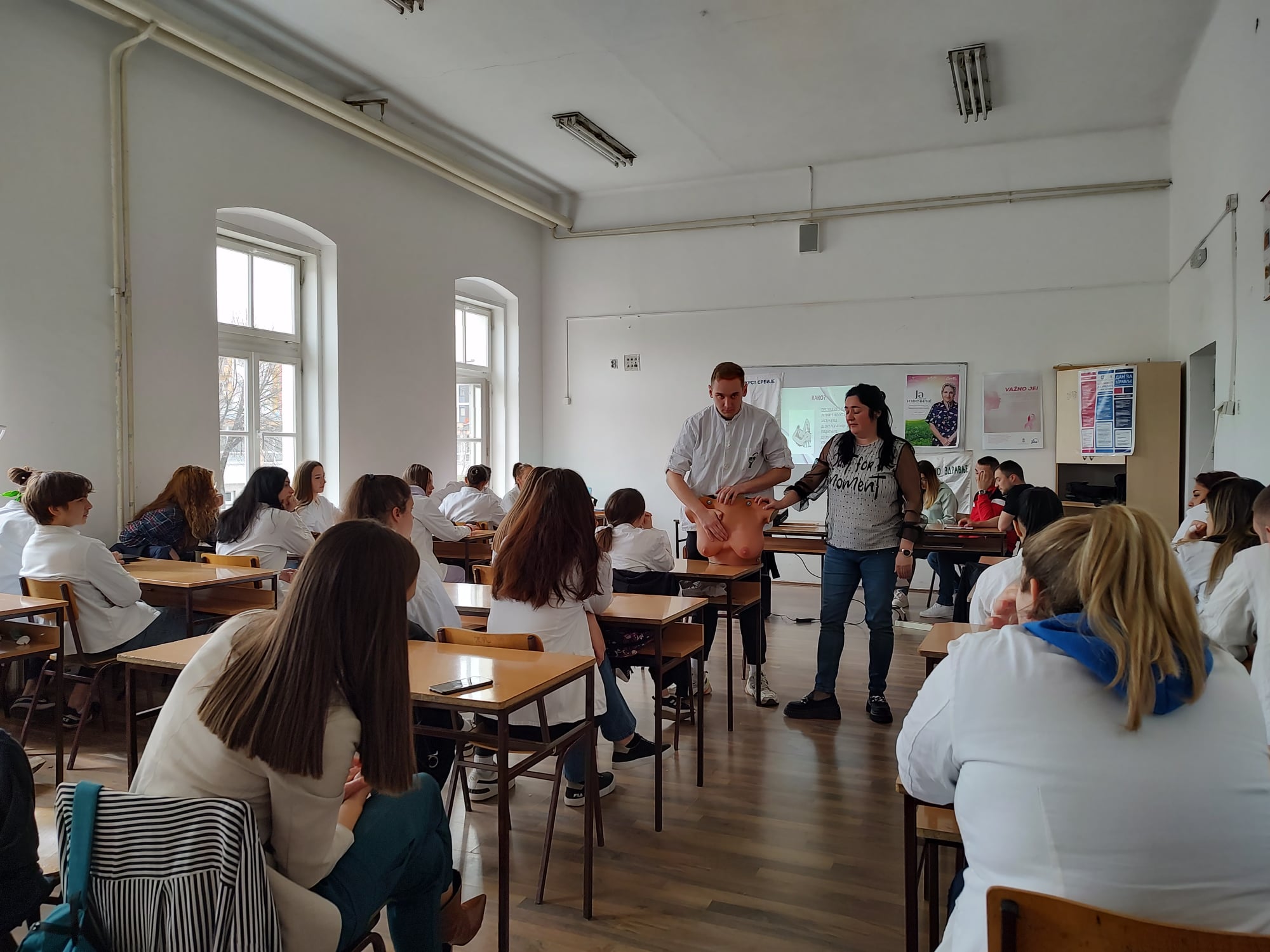Predavač, kasnije i demonstrator na trenažeru ženskog torzoa, bila je glavna sestra službe polivalentne patronaže, Doma zdravlja Valjevo, Vesna Pavlović. Vesna je za učenike pripremila izuzetno zanimljivu prezentaciju koja sadrži sve aspekte izabranog tematskog okvira. Učenici su bili u prilici i da probaju na simulatoru samopregled dojke, koji je od presudnog značaja potpuno izlečenje, u sitacijama kada se bolest otkrije u ranoj fazi. Predavač Zavoda za javno zdravlje Valjevo, Snežana Marinković iz pozicije nutricioniste specijaliste dala je opšte savete vezane za ishranu i prevenciju hroničnih nezaraznih bolesti kao i za faktore rizika koji su korektibilni.