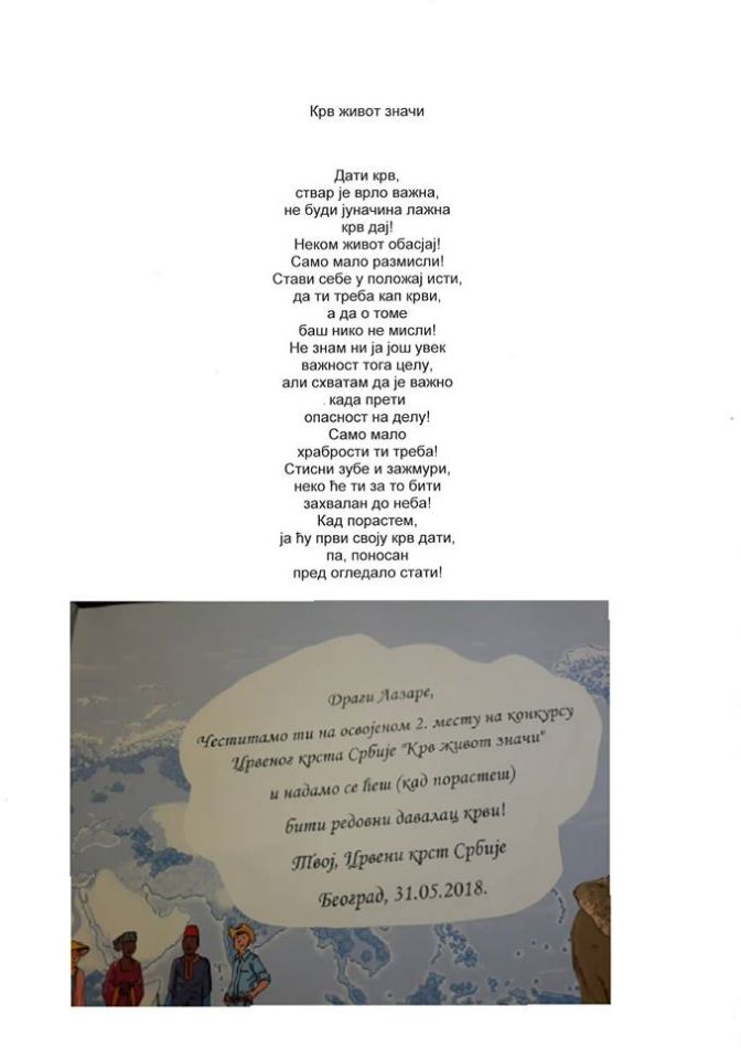 U prostorijama Crvenog krsta Srbije u Beogradu, u četvrtak, 31. maja, upriličena je svečana dodela nagrada za pobednike likovnog i literarnog konkursa „Krv život znači“, za koji je prispelo više od 29.000 radova po uzrasnim kategorijama, a na kojem je učestvovao i Crveni krst Valjevo sa učenicima iz škola Valjevske opštine, na koji smo odabrali i poslali likovne i literarne radove, od kojih je rad našeg Lazara Grujičića, učenika 4/2 razreda iz OŠ „Nada Purić“ iz Valjeva osvojio 2.nagradu na nivou Republike Srbije.